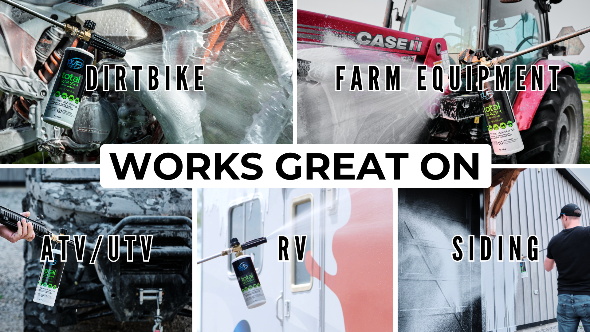 Total wash is a highly aggressive formula that is designed to cut mud and clay fast while being gentle on your rides surface! This should be the first choice when needing to clean really nasty soils that your machine would pick up when offroading.